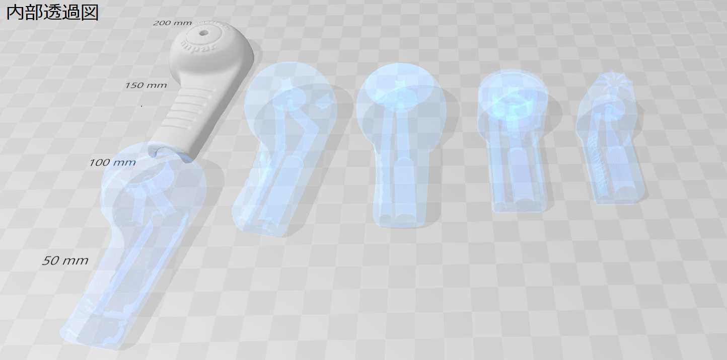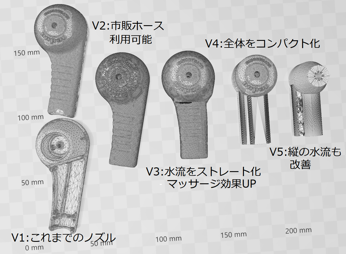 3Dプリンターと3DCADを使うとこれまで金型作成コスト的に不可能だった様々な形状を試すことができます。 オンパーの利点の一つに「ジェット水流によるマッサージ効果」があります。こちらを強化するため複数ステップに分けて段階的に発泡器を改良しました。